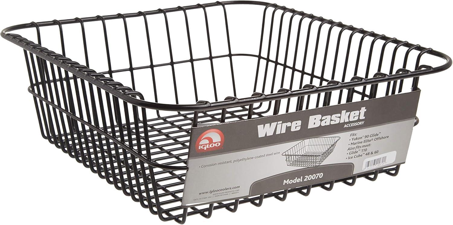 Igloo Wire Cooler Basket comes in black. It is used to store food items, such as sandwiches or chips that you don't want to get wet, or other dry goods. Polyethylene coated steel wire, corrosion resistant coating withstands exposure to ice, water and other liquids encountered inside of cold lockers. Grid pattern of .67 by .98-inch rectangles on the bottom of rack to help prevent smaller items from falling through, yet allowing circulation of cool air into the rack contents. Fits Ice Cube 48, Ice Cube 60 Roller, Glide 110 and Yukon 90 Glide. Approximate dimensions: 14.32 by 13-inches. Made in USA.